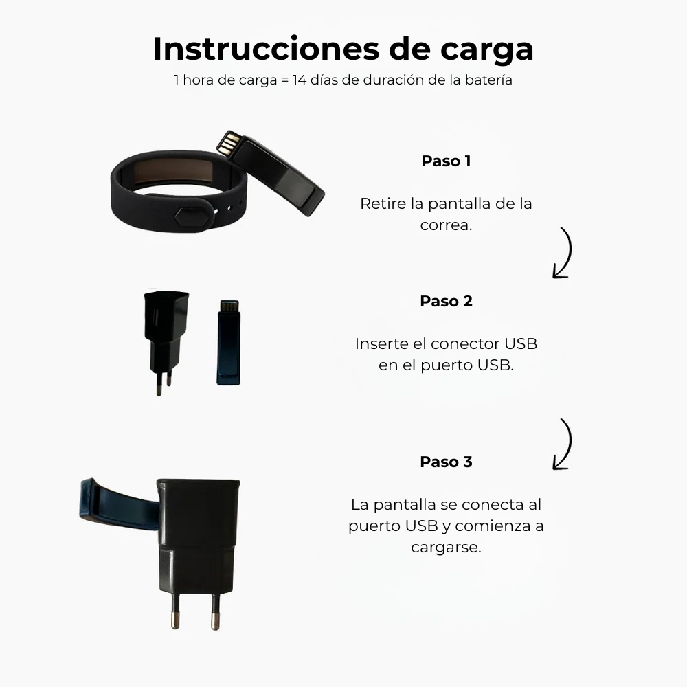 Solo tienes que cargarla, colocarla en tu muñeca y programarla con un simple botón. No necesitas apps ni conexión al móvil.